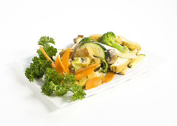 Steamed fish Steamed pangasius filet with finely sliced ginger, leek, coriander and soya sauce